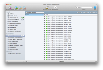 Desde la ventana principal, Little Snitch 3 Preview facilita el filtrado de todos los avisos para ver todas las reglas (aprobaciones y negaciones), diferenciadas por temporales o no aprobadas, protegidas, entrantes, etc.