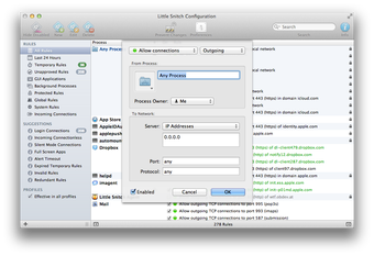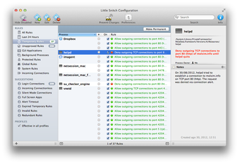 Little Snitch 3 Preview organiza los avisos también por aplicación, y cada regla muestra información del puerto y de la dirección a la que se dirigía la conexión o de donde procedía.